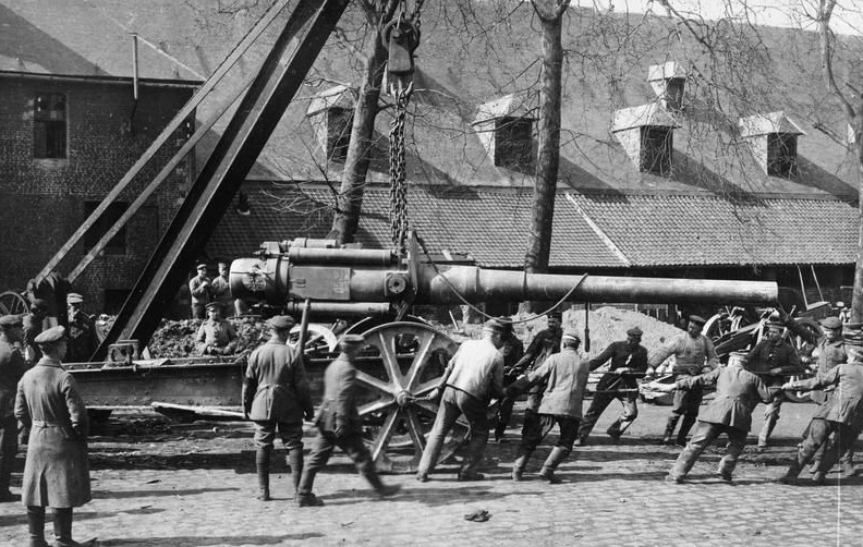 Schwarzweissfoto eines unbekannten Fotographen. Die Kanone, genannt “dicke Berta” wird nach rechts gezogen, wie man an der nach rechts geneigten Haltung der Mitarbeiter gut erkennen kann. Jede andere Körperhaltung würde hier gar keinen Sinn machen. Von daher stammt wohl das Wort “der Zug”, was eine Handvoll mehr oder weniger motivierter Seilzieher im militärischen Sinne bezeichnet. Mehrere Züge bilden dann eine Kompanie, was aus dem Französischen kommt und bedeutet, dass man sich nach getaner Arbeit zusammen in die Kneipe begleitet (s’accompagner). Hier auf diesem Bild könnte man beispielsweise Sperenzus beim Segnen sehen, wenn er denn je so ein Gerät gesegnet hätte.