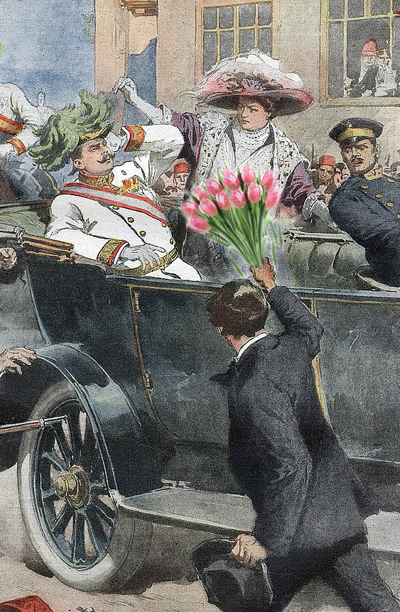 Originaldarstellung: Princip reicht dem Erzherzog und seiner Frau einen Strauß Blumen