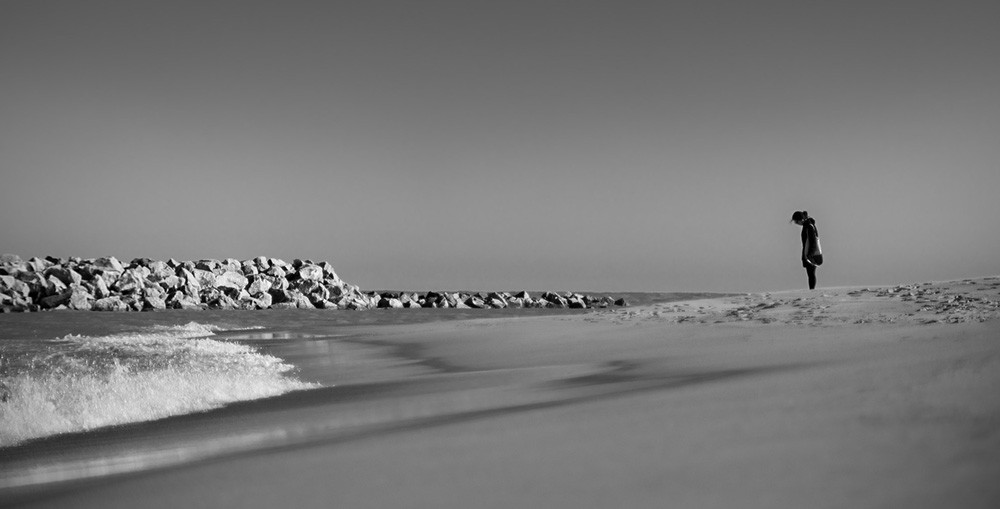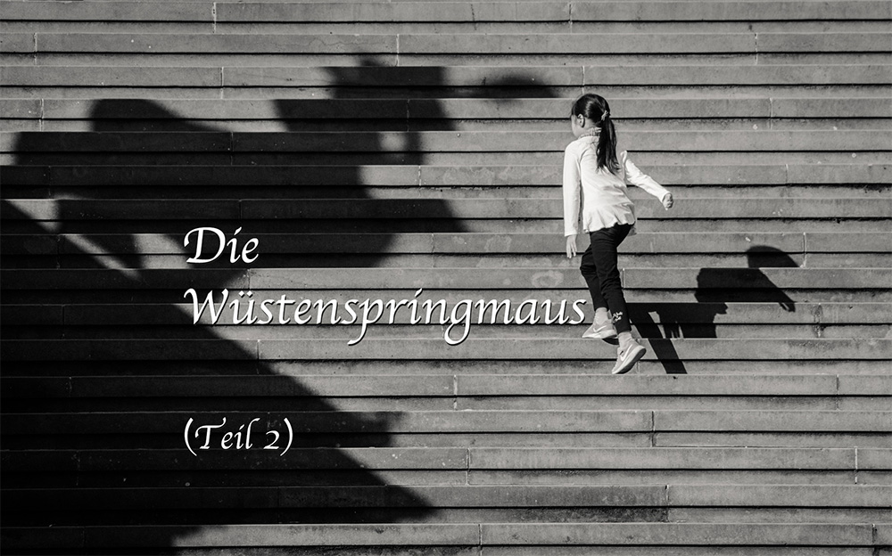 Das Schwarzweiss-Foto eines kleinen Mädchens. Wir sehen es, wie es unbekümmert eine Treppe hochläuft. Von links ragt ein dunkler Schatten auf die Treppe. Er scheint nach dem Mädchen zu greifen. Es ist der Schatten des Todes.