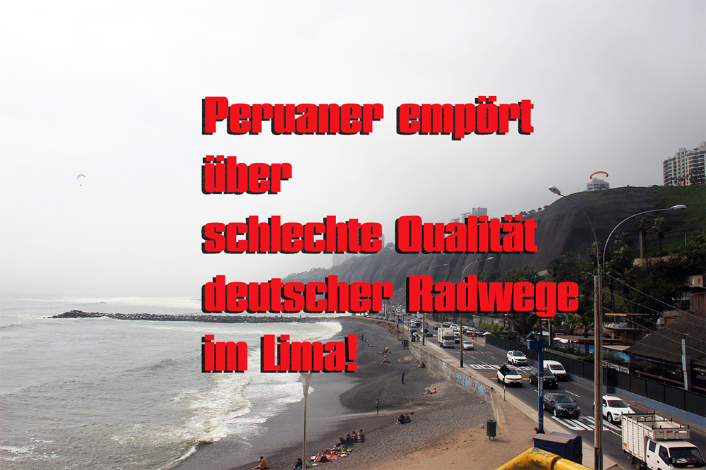 (Markscheid/Lima; dpi): Die Demonstranten vor der deutschen Botschaft in der peruanischen Hauptstadt machen ihrem Unmut am letzten Sonntag deutlich Luft. „¡Descaro!“ (Unverschämtheit) oder auch „¿Cómo se atreven?“ (Was fällt euch ein) steht auf den mitgeführten Schildern. Die Menge tobt. Grund ist die schlechte Qualität der Radwege, die mit deutschen Steuergeldern gerade in Lima gebaut werden.